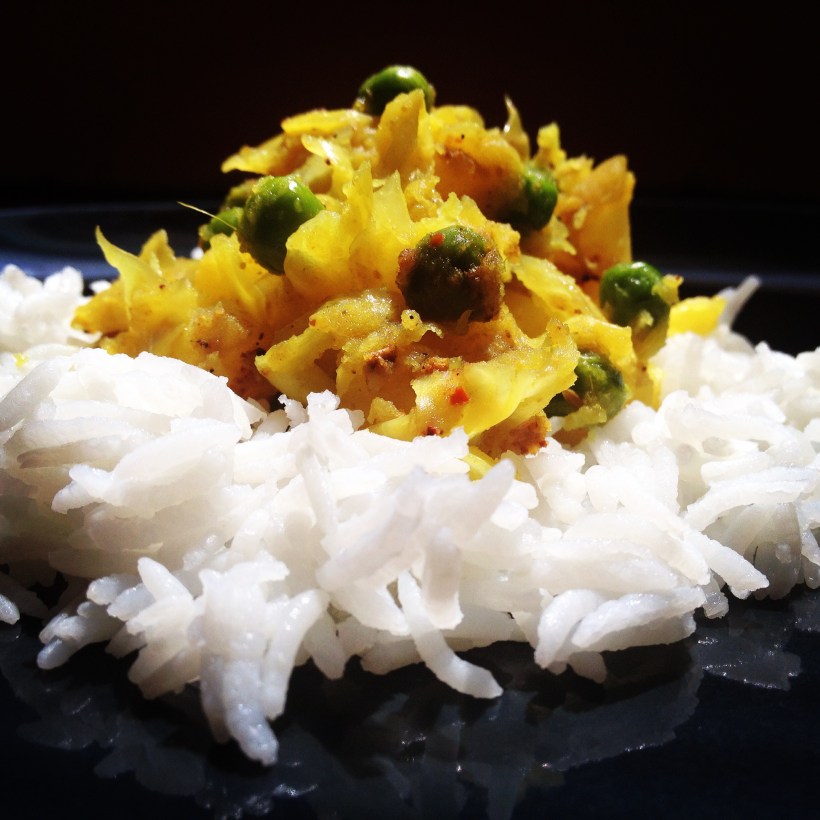 Yesterday I realized that I was the one who was fighting a losing battle. The cabbage hardly showed any signs of withering, apart from a few black specks. So I chopped an oversized potato, which was on the verge of sprouting, defrosted some supposedly sweet green peas and stir fried them with the now shredded cabbage — an often cooked dish in Bengali households.